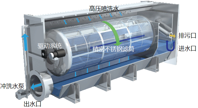 過濾器由設(shè)備結(jié)構(gòu)模塊、過濾模塊、驅(qū)動(dòng)系統(tǒng)、反沖洗系統(tǒng)、自控系統(tǒng)組成。污水流入不銹鋼濾筒內(nèi)部,由于重力的作用由濾網(wǎng)內(nèi)側(cè)向外側(cè)流出,水中的懸浮物被截留在不銹鋼濾筒內(nèi)側(cè)。驅(qū)動(dòng)系統(tǒng)帶動(dòng)濾筒緩慢轉(zhuǎn)動(dòng),反沖洗泵抽取濾后出水對(duì)濾網(wǎng)進(jìn)行反沖洗。沖洗水通過位于濾筒頂部的噴頭由濾網(wǎng)外側(cè)向內(nèi)側(cè)對(duì)濾網(wǎng)進(jìn)行強(qiáng)力沖洗,沖洗下來的顆粒物質(zhì)由反沖洗水收集槽收集,并通過排污管排出設(shè)備。